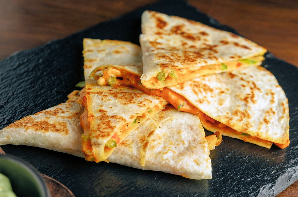 Quesadilla z szarpanym kurczakiem, grillowaną papryką, ogórkiem kiszonym i serem